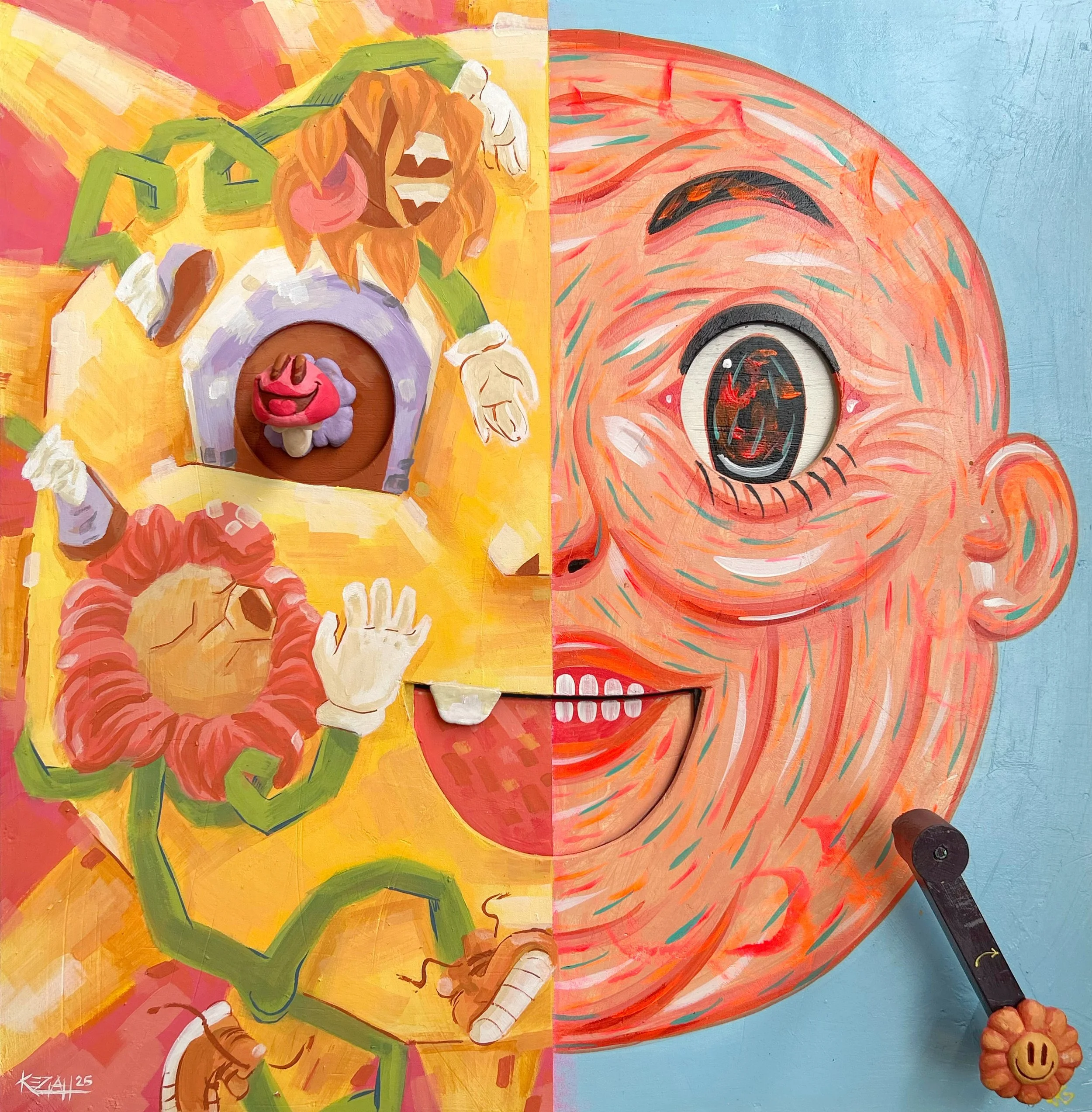 The idea was to match the bright-eyed person Rymnd painted so a sun character came to mind because not only was it literally bright but it also matched the shape. I wanted to incorporate Kiko as well and thought, what if I attached some sculptures to it as well???